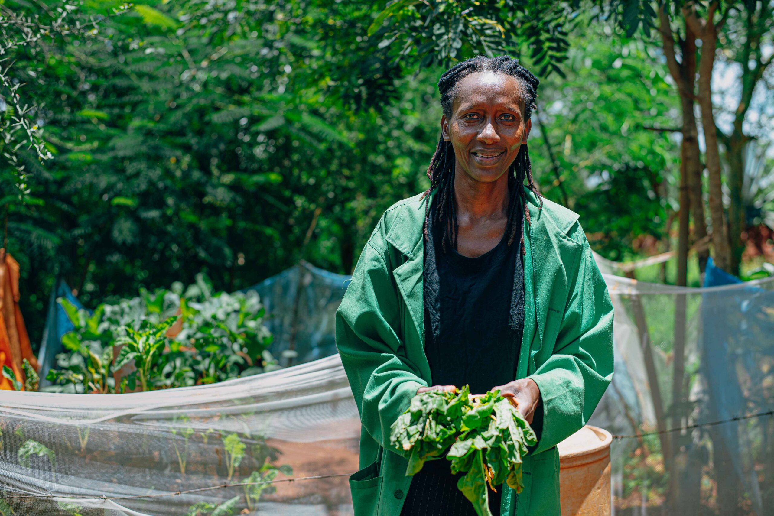 One of the farmers we’ve supported, Wendy, holding vegetables from her vertical gardens.