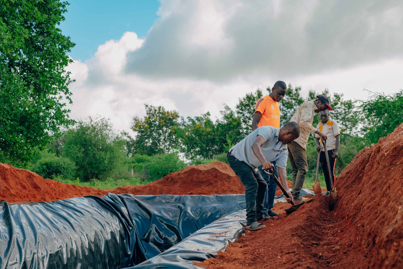 Young men from Machakos setting the foundation for the construction of a water pan.