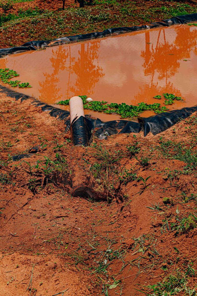 IAG founders alongside Wendy standing next to the water pan we are building in her farm.